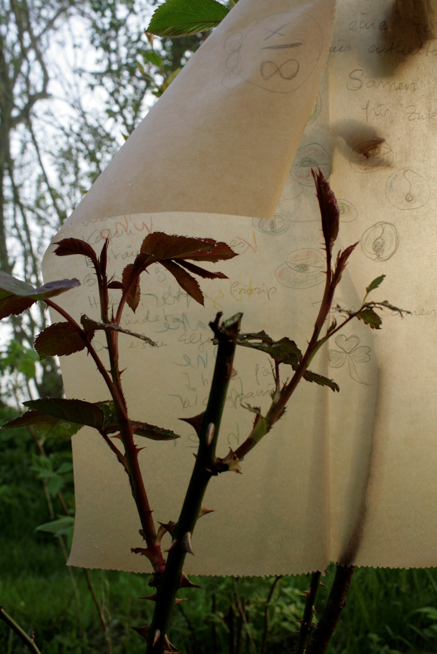 Pergament ist viel zu schön, um nur Butterbrote darin einzuwickeln. Natürlich ist es kein echtes pergament, aber das Durchscheinende illustriert für mich die Hintergründe von Wirklichkeit ganz gut. Die frühe Morgensonne, die Rose. Sagt für mich alles, und ein bisschen geheimnisvoll muss es ja sein,