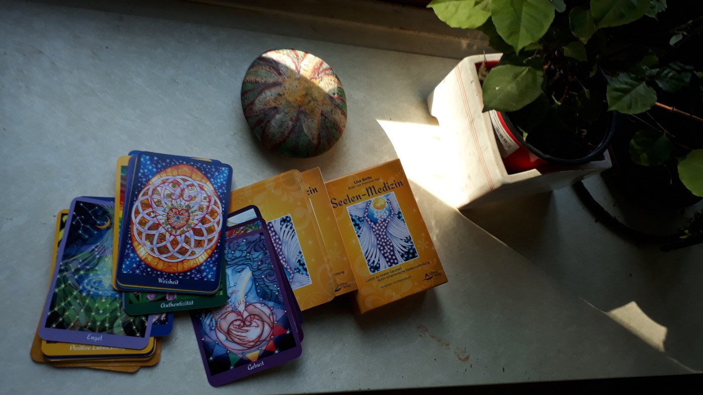 Das Kartendeck „Seelen-Medizin“von Lisa Biritz mit Bildern von Francene Hart enthält 44 Karten mit dem Untertitel: Zurück zu innerer Ganzheit durch schamanische Seelenrückholung. Jeder Karte ist ein Begriff zugeordnet, der im Begleitbüchlein besprochen wird und mit Übungen begleitet. Die Karten sowie die Box sind angenehm stabil. Besonders gefallen mir die Bilder, ihre fröhliche und positive Ausstrahlung sowie die Tiefe, die den Themen dadurch gegeben wird. Ich wundere mich immer, dass die Autorin groß geschrieben wird, und die Künstlerin klein darunter bei diesen Kartendecks. Klar muss jemand das Wissen reingeben, aber so wie mir scheint, muss ja auch die Malerin dieses haben und hat es auch. Es ist eine Kunst, Bilder abseits der bekannten Klischees zu erschaffen, und diese ist tatsächlich eine Medizin, so wie ich sie verstehe. Zum Thema schamanische Seelenrückholung, wie sie hier im Untertitel genannt wird, würde ich nicht ein Kartendeck verwenden. Die ist mit Erfahrung, mit inneren Bildern und Reisen verknüpft, die man üben muss, also wäre dies ein Anfang. Dennoch sind die Landschaften, in die z.B. ein traumatisierter Mensch reisen könnte, nicht ohne weiteres allein zu bewältigen und ich wäre mit dieser Praxis vorsichtig, zumindest aus meiner Erfahrung, denn ich habe das auch erst ohne Lehrer gemacht. allerdings guten Zugang zu spirituellen Helfern gehabt und das kommt zuerst. Großartig finde ich, dass solche Wege überhaupt bekannt gemacht werden, ich halte sie für die wahre Medizin und damit gebührt diesem Kartendeck auch Dank. Ich wurde durch die youtube videos von Anna Selma, der zweite Blick, darauf aufmerksam; sie hat viel im Angebot, was uns helfen kann, tiefer in unsere Heilung einzusteigen, ohne dass es in traditionelle schmanische Arbeit geht.