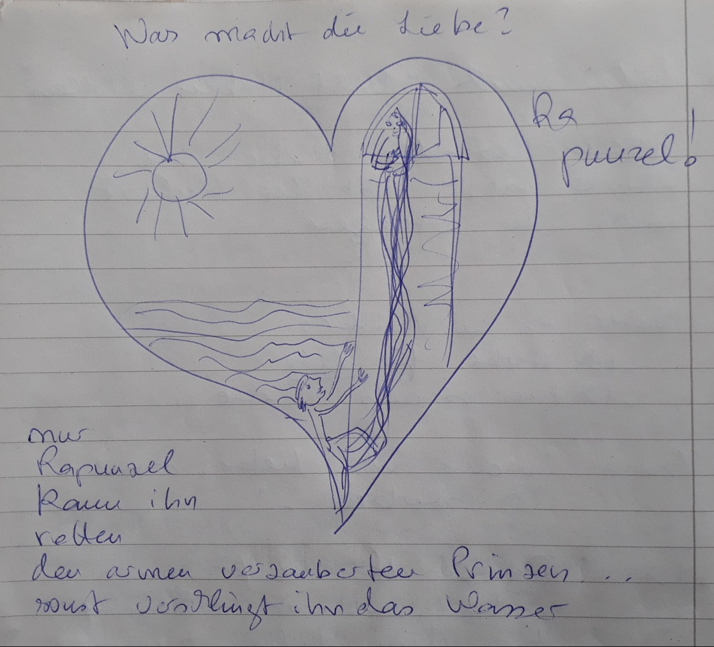 Es begann diesmal mit dieser obigen spontanen Zeichnung, bzw. dem Satz in mir: Rapunzel, lass dein Haar herunter!