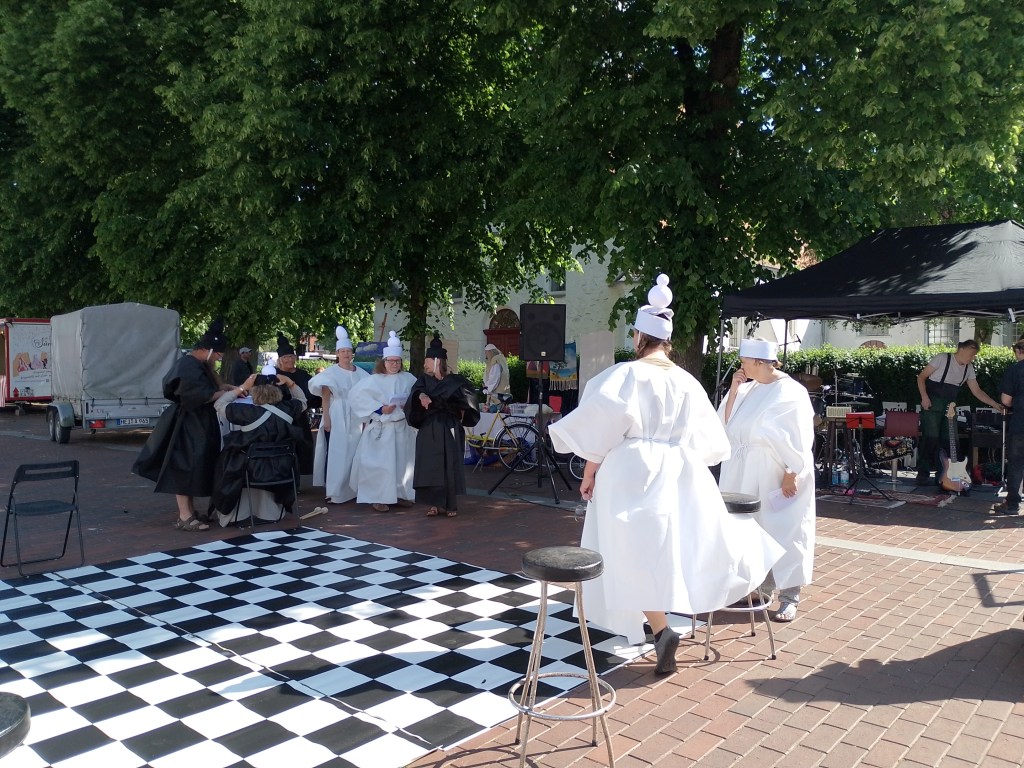 Das musical , von dem ich nur Lieder kannte, überraschte mich mit der Darbietung. Ich hörte jemanden sagen, es sei zu anspruchsvoll für den Marktplatz. Ich glaube, die Idee und die Absicht des musicals ist ernsthaft und wurde auch so umgesetzt, insgesamt aber doch etwas überfordernd, den Texten zu folgen. Die Darstellung dagegen einfach,plastisch, fast pantomimisch und gut verständlich. In Länge von 23 Liedern kann ich mir das nicht vorstellen. Da ich die Geschichte bereits gelesen habe, bringe ich die Ankündigung einer Zukunftsvision nicht ganz in Einklang mit der Art der Aufführung. Ich hörte auch einen Musiker sagen, dass die Grundstruktur der Stücke sehr ähnlich sei, (zu ähnlich) davon verstehe ich nichts.