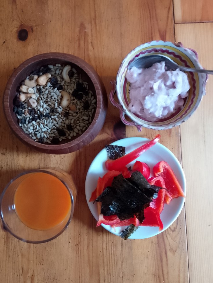 Daneben ist der Schreibtisch doch ordentlich. Und mein Essen immer , farblich abgestimmt…und ein neuer Versuch, mehr Richtung Paleo zu essen.