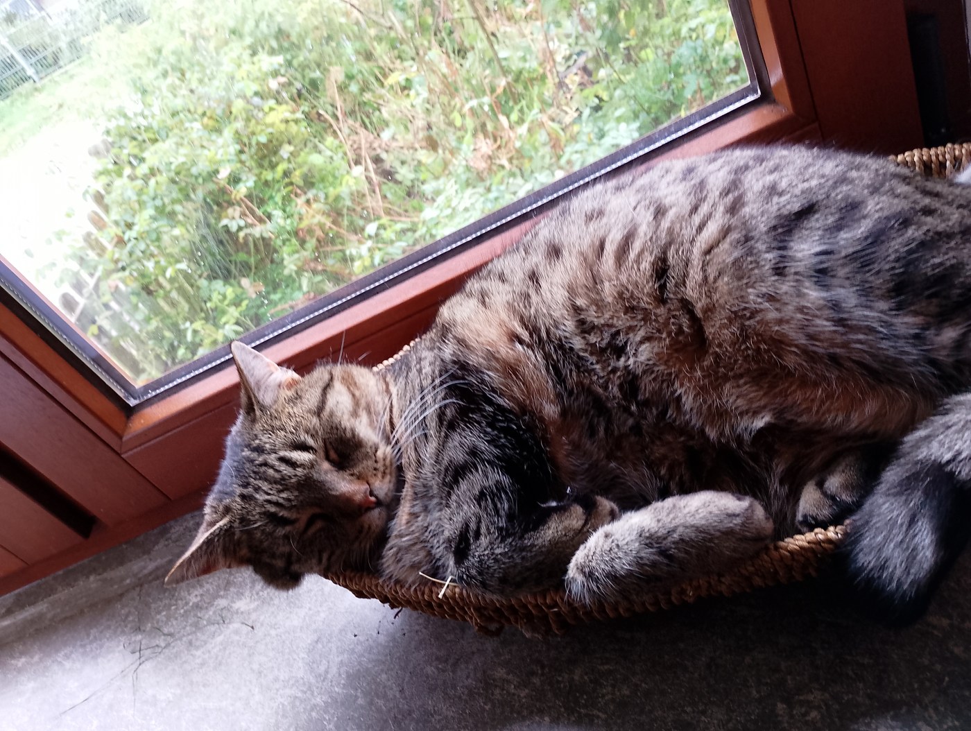 Martha hingegen, ebenso wie die anderen Katzen, machten es sich lieber gemütlich. Der wilde Kater hat im Strandkorb seinen Platz gefunden, wo nun eine Hülle darüber ist, also windgeschützt, mit einer Lücke für ihn. Er streicht mir morgens um die Beine, wenn ich aber die Schüssel hinstelle, hackt er mir mit Krallen in die Hand. Das geht dann nur noch mit Handschuh…
