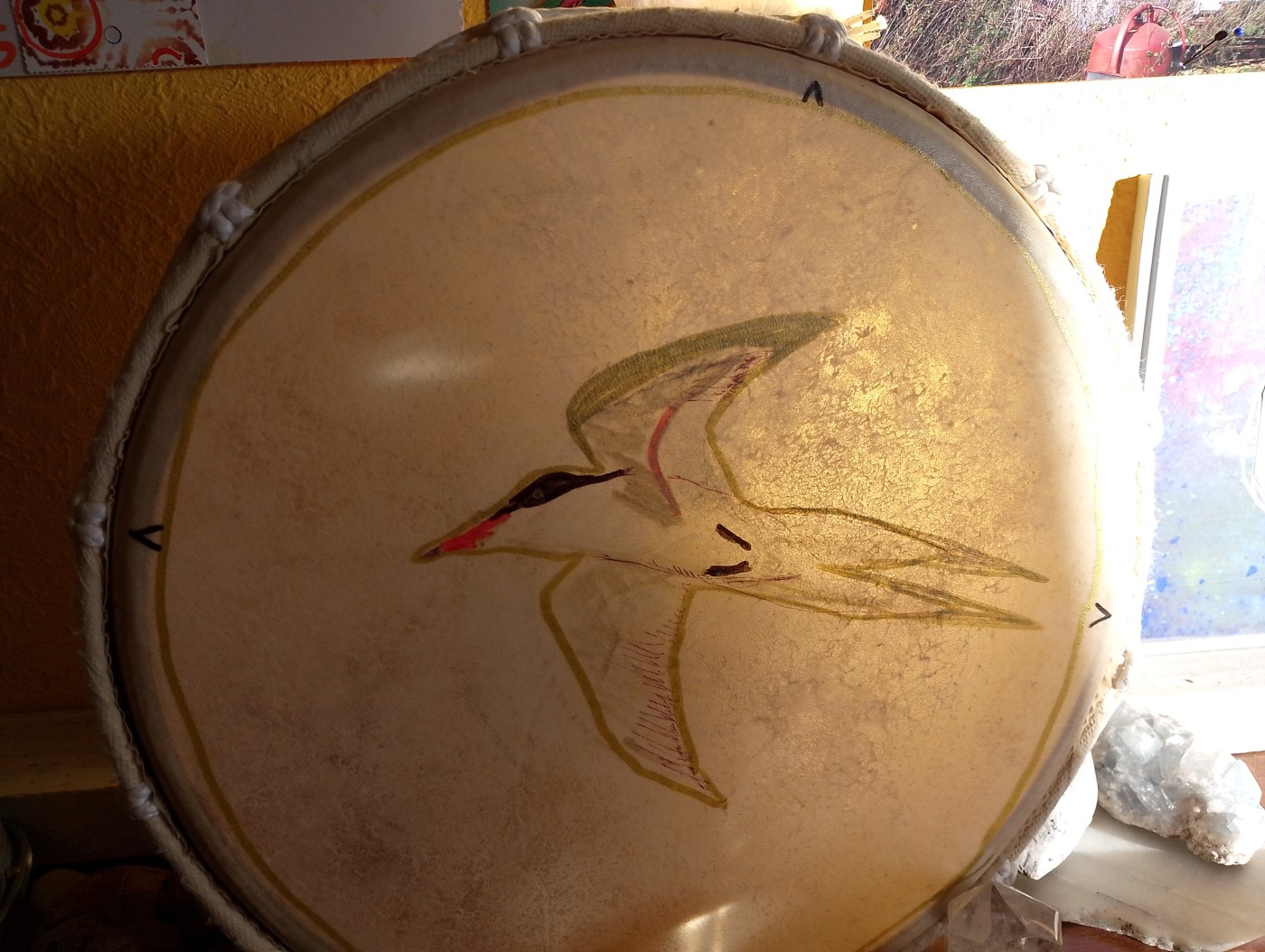 Es gibt immer wieder workshops zum Trommelbauen. Finde ich schön. Ich mache es nicht selbst, ich habe sie aber bemalt. Das soll eine Flussseeschwalbe sein, die aber eher wie ein Geistvogel in die andere Welt für mich aussieht. In Erfde gibt es Trommelreisen auf dem Hof Sinnvoll, lese ich. Das ist hier nicht so häufig, und oft muss man weit fahren. Es interessiert mich. Zugezogene kaufen einen Riesenhof und machen ein Seminarhaus daraus. Meistens scheitern sie am fehlenden Interesse.