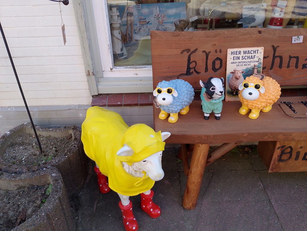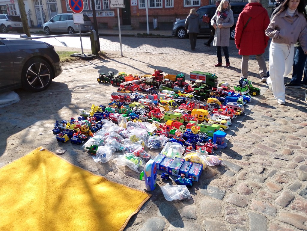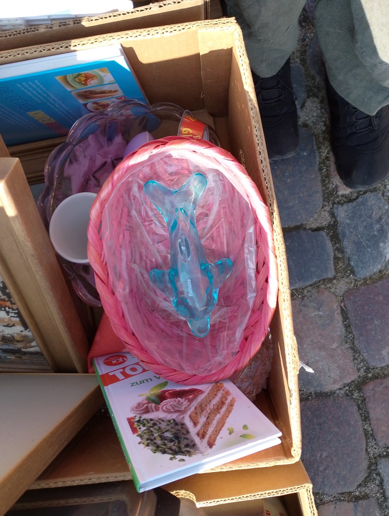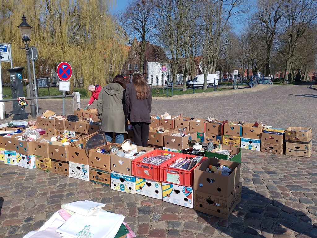 Auf dem Flohmarkt, dem ersten dieses Jahres in Friedrichstadt, war ordentlich was los heute. Gute Laune und nette Leute, ich erstand schon wieder einen Keramikfrosch. Ich hätte doch gern eine Vorgartenfigur- auf gar keinen Fall einen Buddha. Das ist ja schon inflationär, diese Buddhaköpfe aus der Serie, und keiner der einen hat, ist auch Buddhist. Dann würde da ja ein Altar davor sein mit den Opfergaben, nicht wahr.