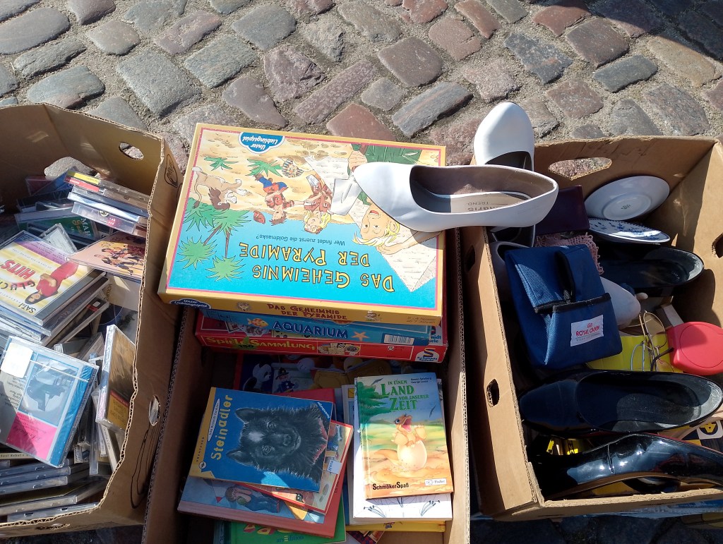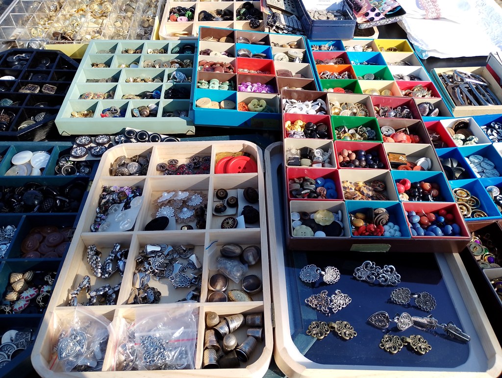Bei dem alten Herrn mit den vielen Kisten, wo alles nur 1 Euro kostet. Knöpfe gab es auch, Bücher nichts für mich, viel zu sehen.