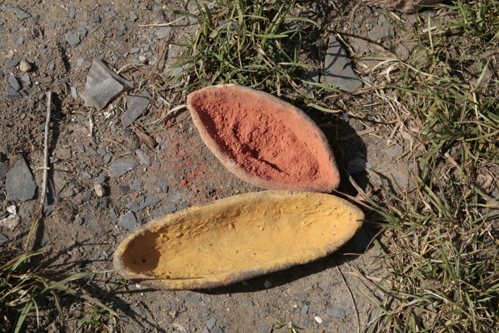 Die farbigen Pigmente sind bereit gestellt, um sich eine Bemalung zuzulegen. Das wurde auch schon in body painting Tagen während des sommerlichen Steinzeittreffens ausgiebig gemacht. Das findet jedes Jahr statt und da wird experimentell steinzeitliches Gemeinschaftsleben geprobt, mit Arbeiten rund ums Handwerk und mitten im Publikumsverkehr. Immer wieder toll zu sehen, welche selbstgemachten Gewänder getragen werden.
