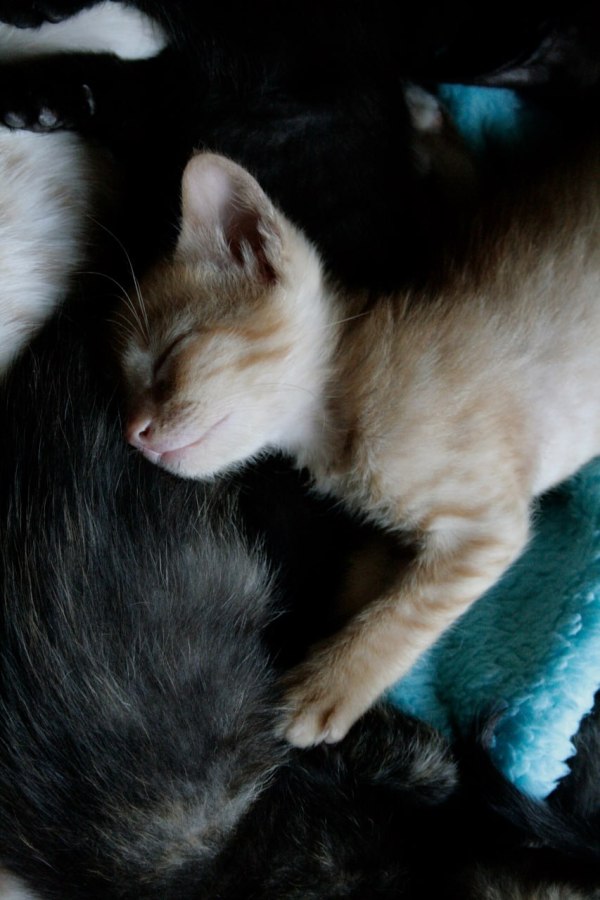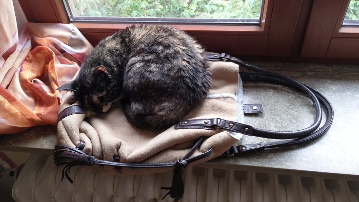 Bei mir ist Martha eingezogen, eine dicke gemütliche Tigerkatze, die schon Monate draußen lebte. Sie traute sich endlich durch die Katzentür, – also nicht, dass meine anderen das toll finden, sie ist unglaublich verfressen- und verzog sich sogleich nach oben in die leere Wohnung, damit sie bloß keinen stört. Vielmehr , sie legte sich in das Gästebett….