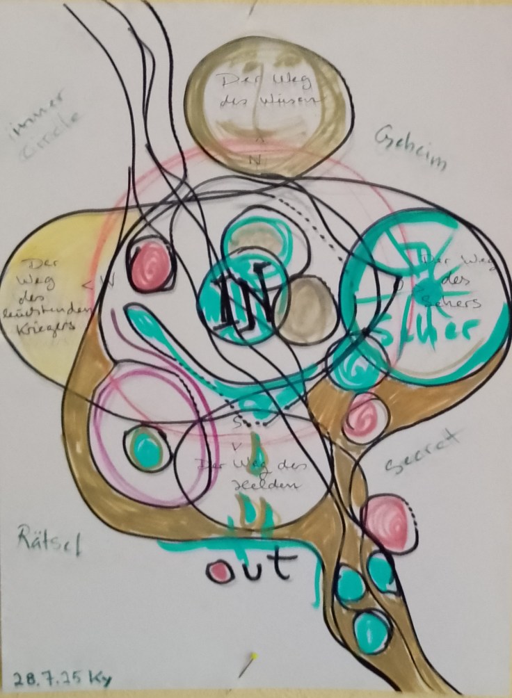 https://www.arte.tv/de/videos/109358-199-A/stadt-land-kunst/ In dieser Sendung fand ich ein paar gute Erklärungen dazu, die mir neu waren. Doch, dass es spirituell ist, weiß ich. Und ich male manchmal ganz ähnliche Sachen, Kreise, Wirbel, das kommt ganz von selbst aus dem Handgelenk. Wir könnten ganz naturalistisch malen, aber wozu. Dennoch- so etwas in 2×3 Meter Größe und daraus mein Leben werden zu lassen, das wäre mir dann dochzu ernsthaft. Ich bewundere solche Determination. Ein deutsches Wort dafür fällt mir nicht ein.
