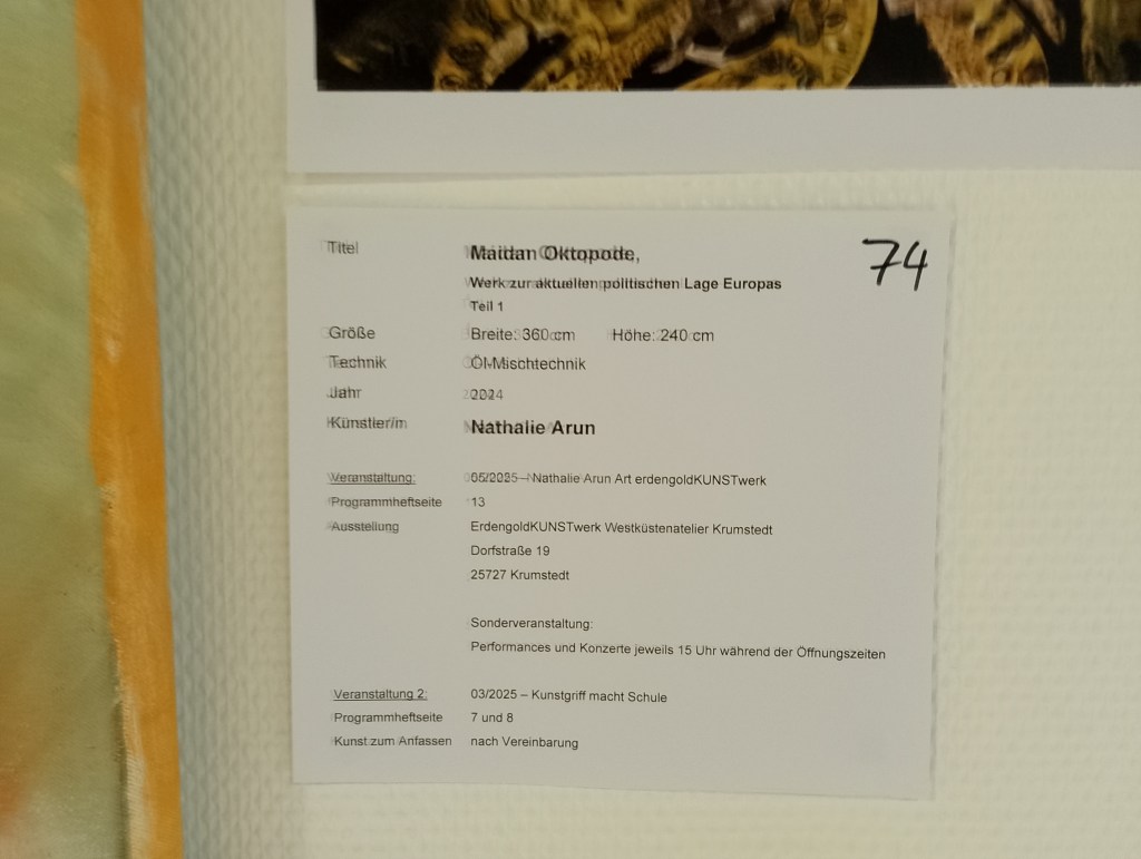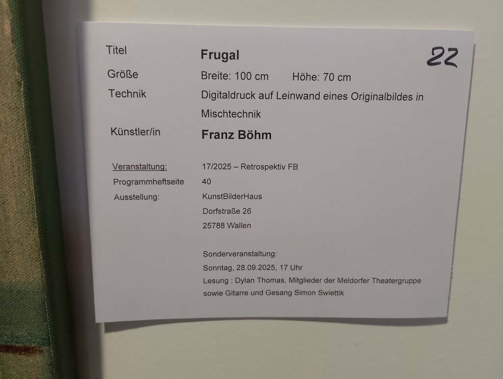 Ja, es gäbe noch viel mehr zu sagen. Da habe ich nun auf der Liste so viele Künstler, die ich gern sehen würde. Aber das an zwei Wochenenden? Ich werde es nicht schaffen. Es stehen noch andere Dinge auf dem Programm, unter anderem der Besuch der Messe Weite Horizonte in Eckernförde. Außerdem zieht oben in der Wohnung der neue Mieter ein. Seit 2 Jahren wohnte ich wieder allein im Haus.