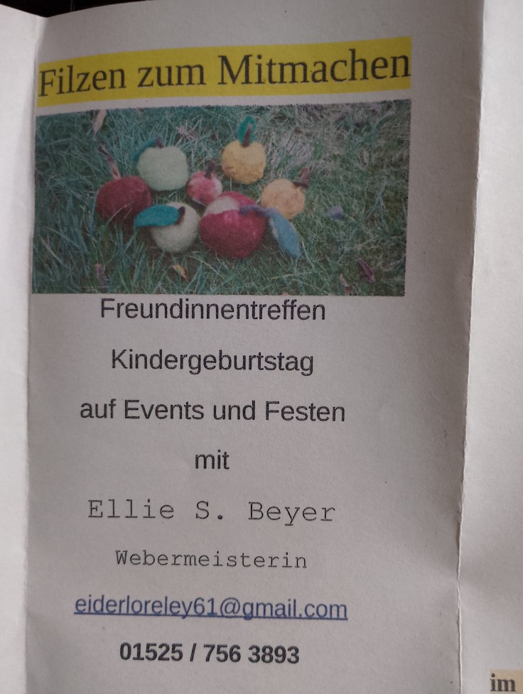 in der Wassermühle und sie bietet dort Mitmachaktionen rund um Wolle an, Filzen, Spinnvorführung und anderes. Einmal werde ich über die tolle Ellie Beyer schreiben, was sie alles macht.