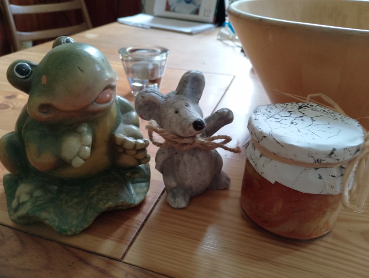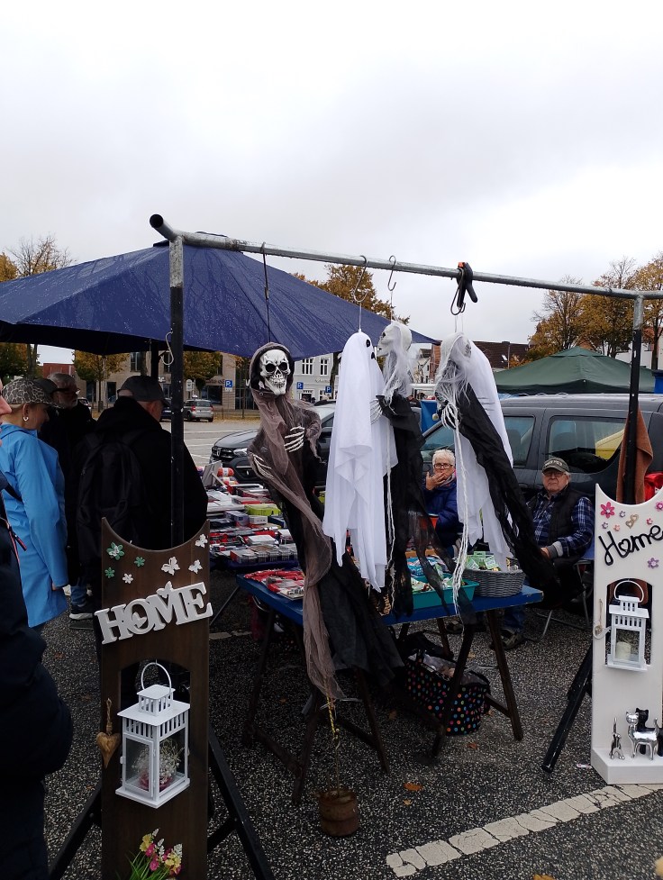 Und dann war ich unterwegs, -der letzte Große Flohmarkt auf dem Heider Marktplatz brachte mir allerlei Getier ein- obwohl wegen des morgendlichen Nieselregens weniger Stände da waren. Ich empfand das als sehr angenehm, ich guckte genauer hin und die Weihnachtsmaus wurde mir so nett erzählt, -die muss nun meinen Kuchen bewachen…