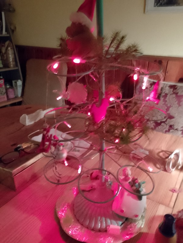 Die Weihnachtsbaumtasse! Ein als kitschig belächeltes Geschenk, das ich aber jeden Morgen für meinen Tee benutze- weil es sich gut umfassen lässt, ohne aus der Hand zu rutschen. Woran man so denken muss mittlerweile…Der Tee ist roter Roibos.