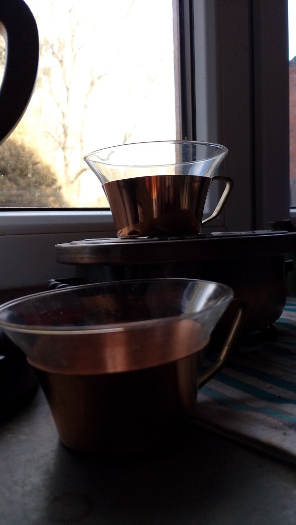 Mein Kaffee muss aus der spanischen Expressokanne kommen, schon wegen dem brodelnden Geräusch, ich setze sie auf einen kleinen Gaskocher, aufs Feuer wie damals. Obwohl der echt spanische Kaffee ganz anders riecht und schmeckt. Anfang des Jahres bekam ich welchen mitgebracht. Naja, ich mache ihn nur noch halbstark, sonst fängt das Herz an zu rennen.