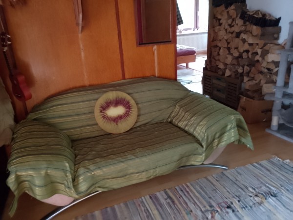 Und das dem edlen Designerstück, welches wir, aufgrund eines winzigen Fleckes wohl, im Sozialkaufhaus fanden. Damals wurde es für einen Freund – in den Bauwagen transportiert, in dem er lebte. Die Fußbodenbretter waren so morsch, dass das schwere Sofa mit den Trägern Glück hatte.