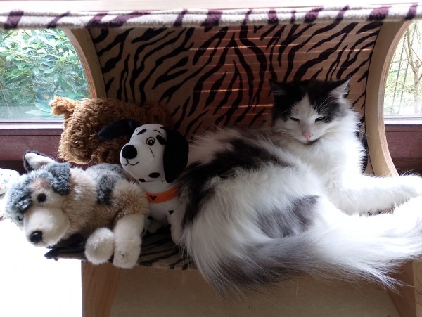 Martha hingegen, ebenso wie die anderen Katzen, machten es sich lieber gemütlich. Der wilde Kater hat im Strandkorb seinen Platz gefunden, wo nun eine Hülle darüber ist, also windgeschützt, mit einer Lücke für ihn. Er streicht mir morgens um die Beine, wenn ich aber die Schüssel hinstelle, hackt er mir mit Krallen in die Hand. Das geht dann nur noch mit Handschuh…