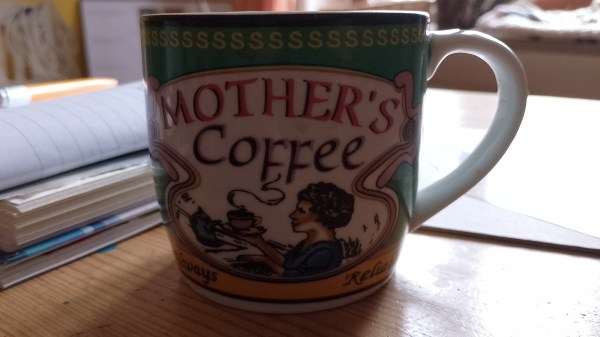 Jedenfalls ist dies derzeit meine Lieblingskaffeetasse, und es heißt ja auch Mother’s Coffee. Richtig, sagt mein Übersetzer. Er übersetzt das als Kaffee für die Mutter, lustig. Meiner Mutter damals war der Kaffee eine heilige Stunde. Ich selbst bin keine Mutter, und nicht wie das Bild suggeriert, Hausfrau und immer verlässlich. Ich bemuttere aber doch gerne alles, auch Männer, Katzen, Igel,und so weiter.